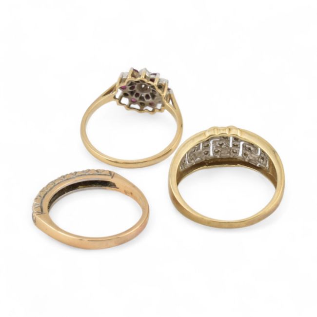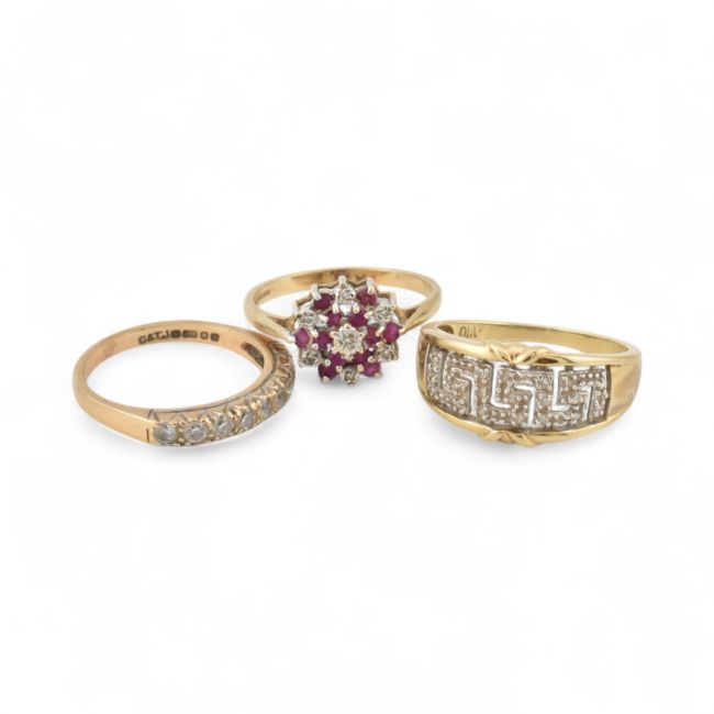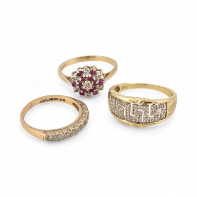Three hallmarked gold rings to include a 9ct gold and diamond ring, hallmarked 9ct gold and white stone ring, hallmarked 9ct gold cluster ring. Weight 9.1g, sizes S, T & Q