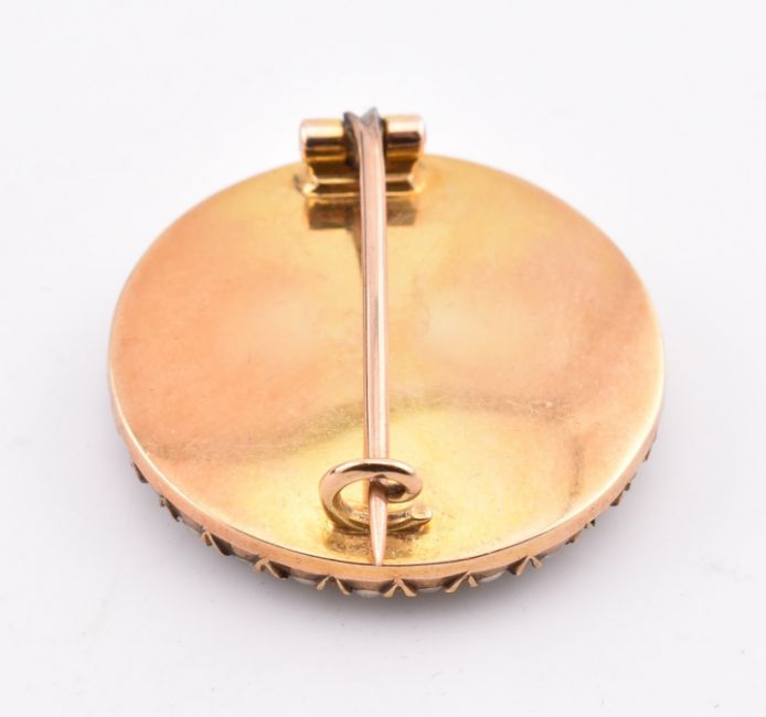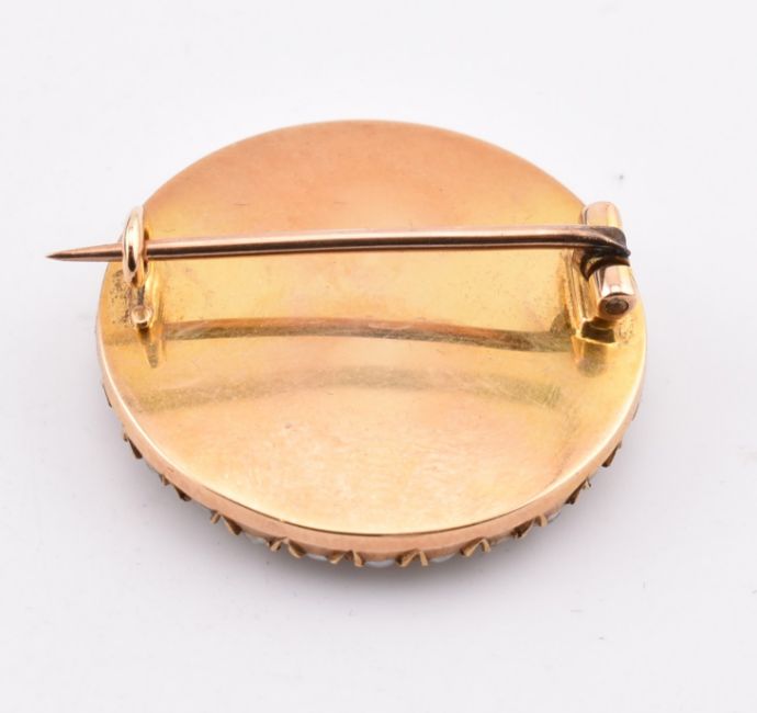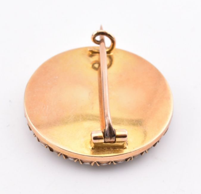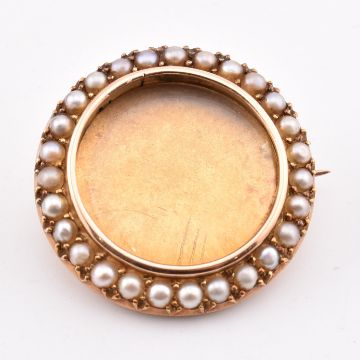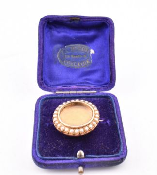 Victorian gold and half pearl portrait locket brooch pin cased. Hinge pin and C clasp verso. Unmarked tests indicate 18ct gold. Total gross weight 11.50g. Measures 2.8cm. Case marked for A Bronkhors, Adelaide. All weights, measurements and sizes are approximate.
