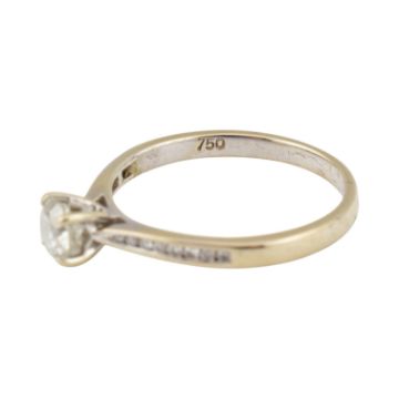 A hallmarked 18ct gold and diamond solitaire ring. The ring set with a round brilliant cut diamond, having diamond-set shoulders. Hallmarked Birmingham. Estimated principal diamond weight 0.45ct. Size O.
