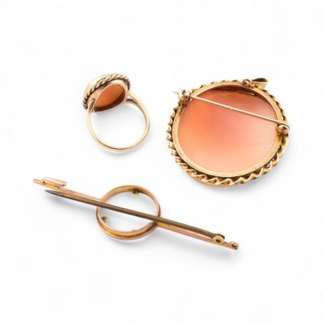 A hallmarked 9ct gold carved shell cameo ring. A cameo brooch together with 9ct gold knife bar brooch with a missing centre stone. Weight 19g.