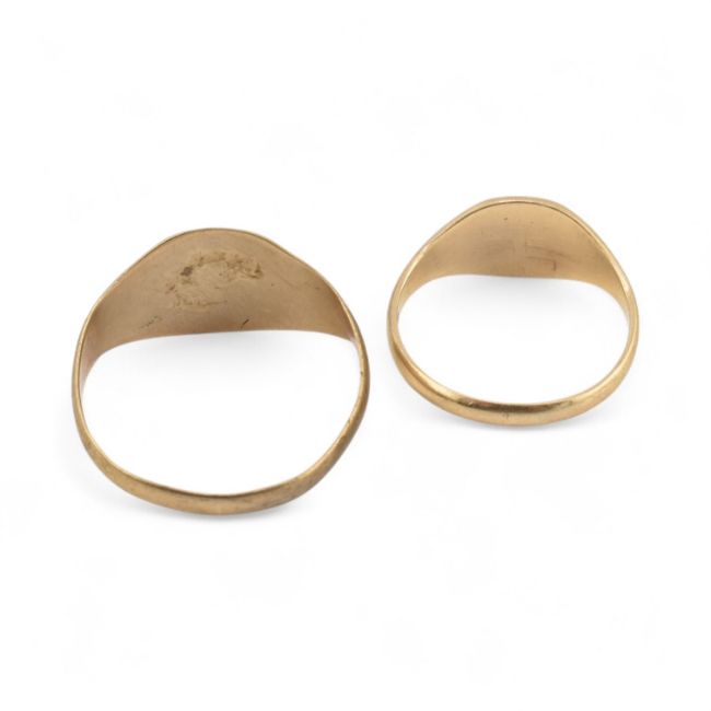 Two hallmarked 9ct gold signet rings. Ribbed shoulders with rubbed cartouche heads. Hallmarked Birmingham & London. Weight 4.9g. Sizes W & P.5