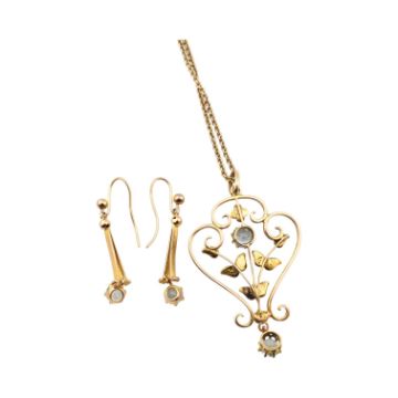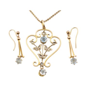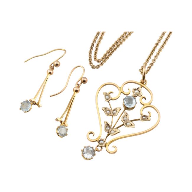 Early 20th century Edwardian aquamarine and pearl pendant necklace and earring suite. The pendant marked 9ct. Barrel clasp stamped 9ct. Total weight 7.2g. Pendant measures 4.3cm
