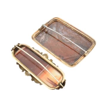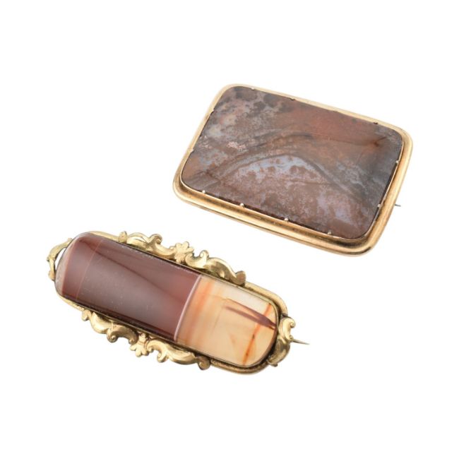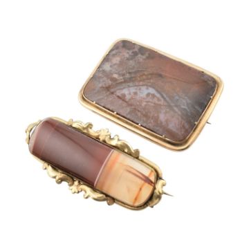 Two 19th-century agate specimen brooch pins. Both having yellow metal mounts with hinge pin and c clasp verso. Measures 5.8cm and 6.3cm