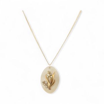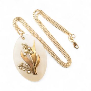 A gold and mother-of-pearl lily of the valley pendant necklace. The curb link chain stamped 14K 585. The pendant unmarked tests indicate gold. Total weight 10.5g.
