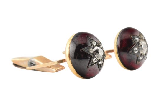 A pair of 19th century gold garnet and diamond set cufflinks. The cufflinks having star set old cut diamonds to garnet cabochons with a later added cufflink fitting. Unmarked tests indicate gold in parts. Heads measure approx 12mm each.