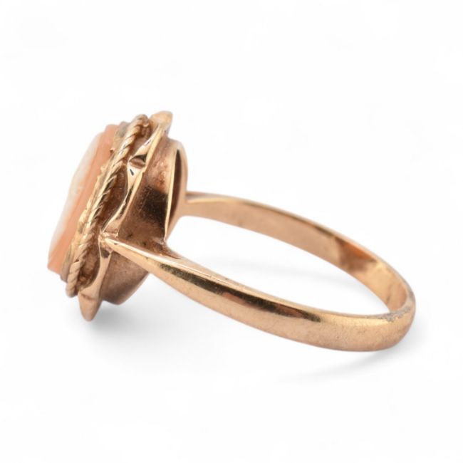 A 20th century gold cameo ring. The ring with carved shell cameo of a female bust. Stamped 9ct. Total weight 3g.