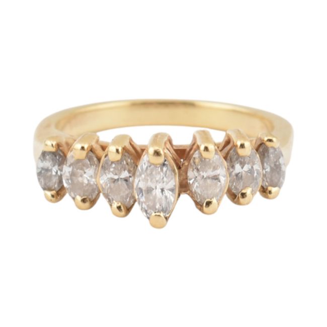 A gold and diamond seven stone ring. The ring set with seven marquise cut diamonds to a tapering shank. Unmarked tests indicate 14ct gold. Estimated toal diamond weight 0.50ct. Weight 4.5g. Size M.5.