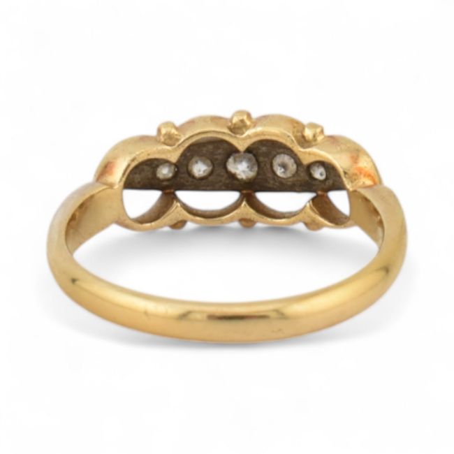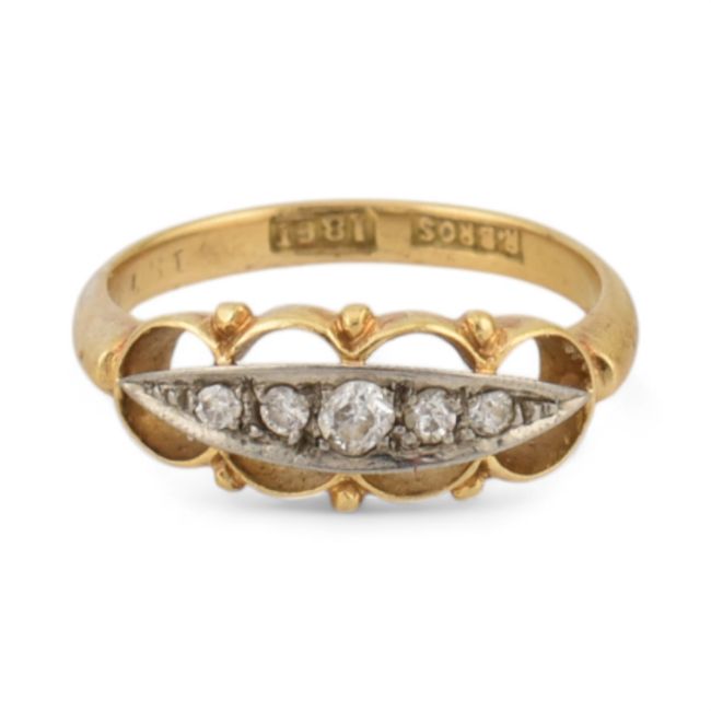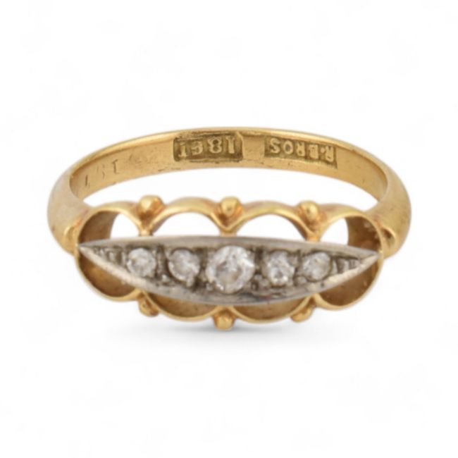 18ct gold and diamond five stone ring. Estimated dia weight 0.10cts. Stamped 18CT, RBros. Weight 2.3g, size L All weights, measurements and sizes are approximate.
