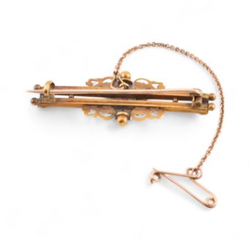 A Hallmarked early 20th century 15ct gold ruby and diamond set brooch. Pin verso with safety chain. Complete with original box. Hallmarked Chester 1914. Weight 3.2g. Measures 4cm approx