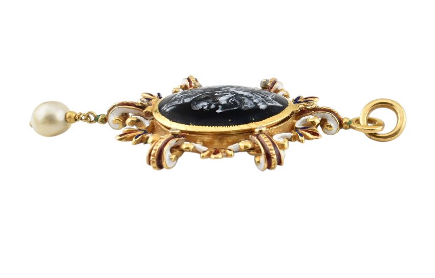 A Victorian renaissance revival gold diamond, enamel and pearl locket pendant, circa 1870. The necklace pendant with central enamel cameos of classical busts - one possibly Emperor Titus. The cameos are framed by an enamel and diamond set mount having pearl pendant suspended below. The pendant opening to reveal a locket compartment. Unmarked tests indicate gold. Measures 6.8cm including bail. Weight 22.9g. All weights, measurements and sizes are approximate.