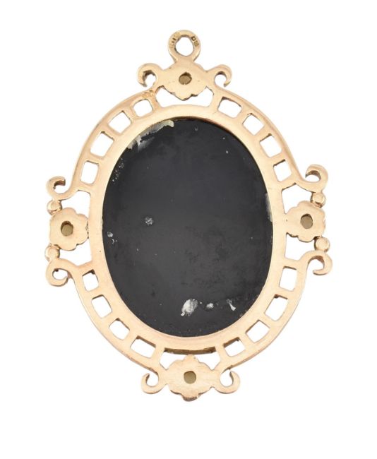 A 1970s hallmarked 9ct gold cameo necklace pendant. The pendant having a carved bust of a woman on an onyx base with a pearl set frame. Weight 9.2g. Measures 4.5cm.
