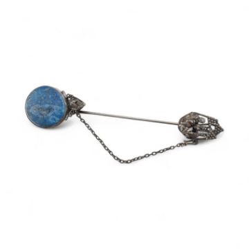 A 19th century Arts & Crafts white metal jabot pin. The pin with enamel mounted roundel having foliate filigree decoration. Weight 8.1g. Measures 9.5cm. With a case marked for Cashmore & Co, Birmingham.