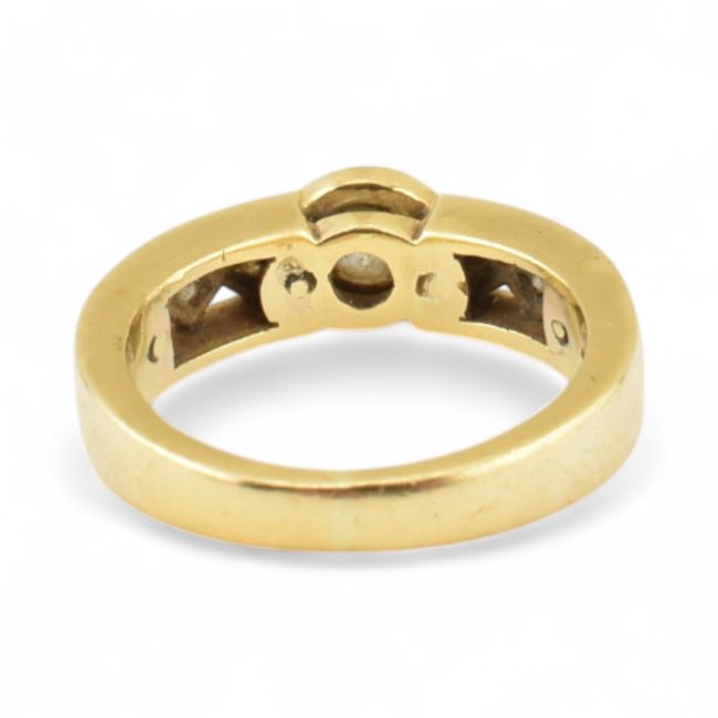 A hallmarked 18ct gold and diamond seven stone diamond ring. The ring set with a central round brilliant cut diamond having princess cut diamond set pierced shoulders. Weight 5.7g. Size K.