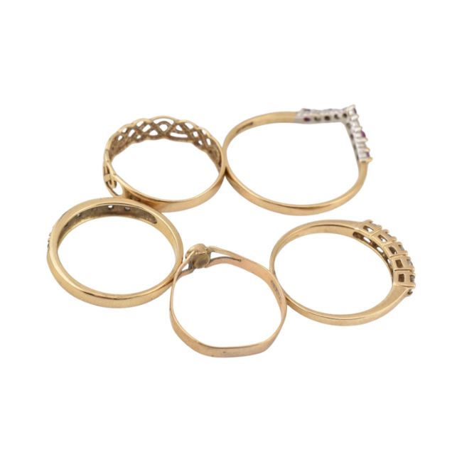 Five 9ct gold dress rings. The rings to include a gem-set wishbone ring, a Celtic knot ring. Total weight 6.5g. Sizes K - X