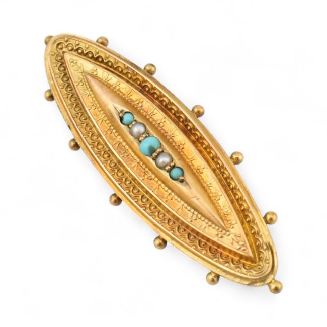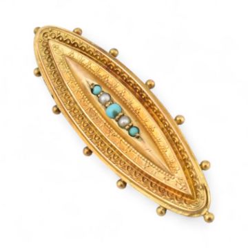A 19th century Victorian 9ct gold pearl and turquoise locket brooch pin. Unmarked, tests indicate 9ct gold. Weight 3.3g, measures 4.5cm approx