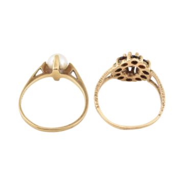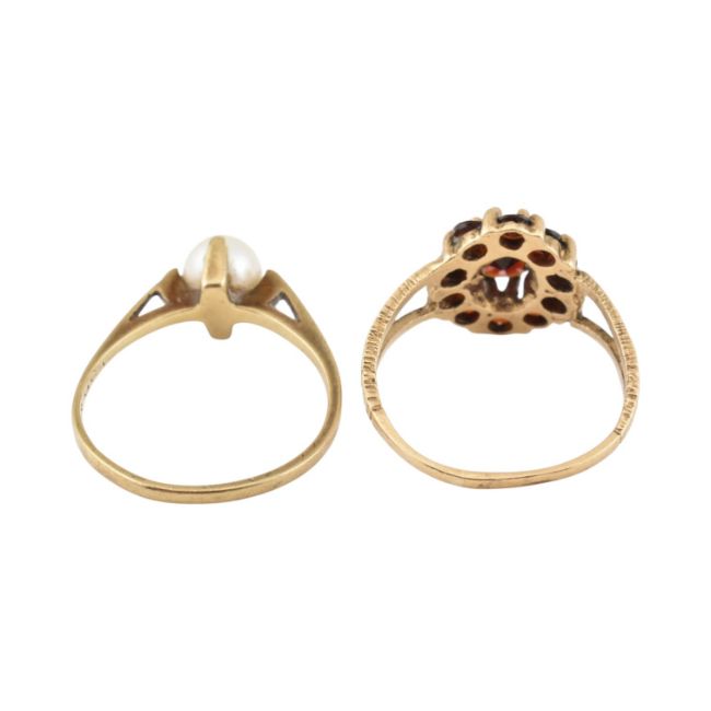 Two 9ct gold gem set rings. A 9ct gold and pearl ring, together with a garnet cluster ring. Total weight 3.93g. Sizes O and N.5.
