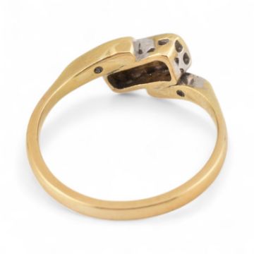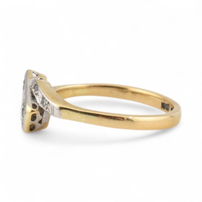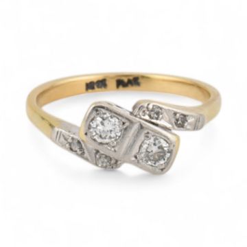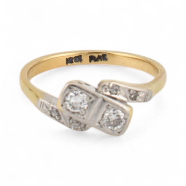 Art Deco 18ct gold and platinum diamond crossover ring. Stamped 18ct Plat. Estimated dia weight approx 0.20cts. Weight 2.9g, size M.5
