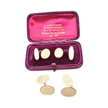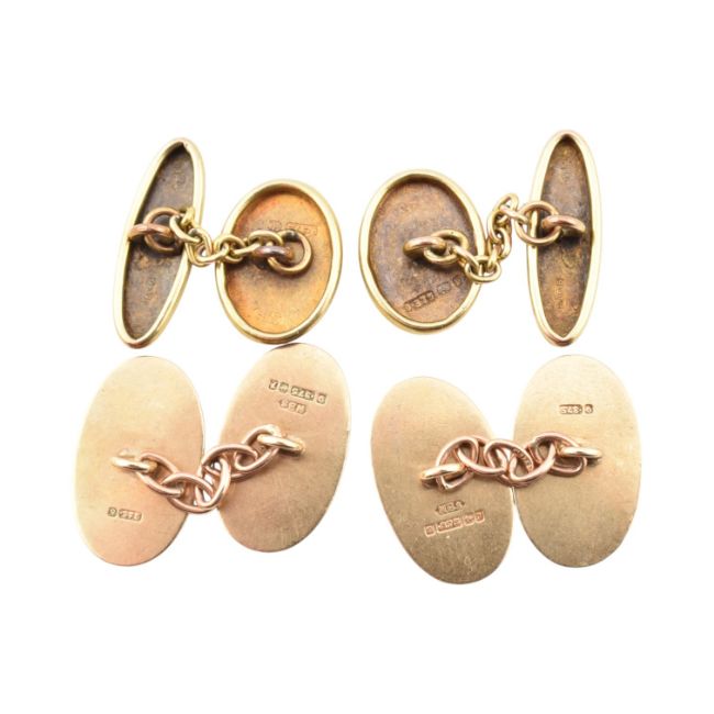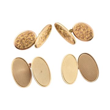 Two pairs of 9ct gold cufflinks. One pair with engine turned decoration to oval head, the other with etched foliate decoration. Both are hallmarked Birmingham. Weight 7.4g.