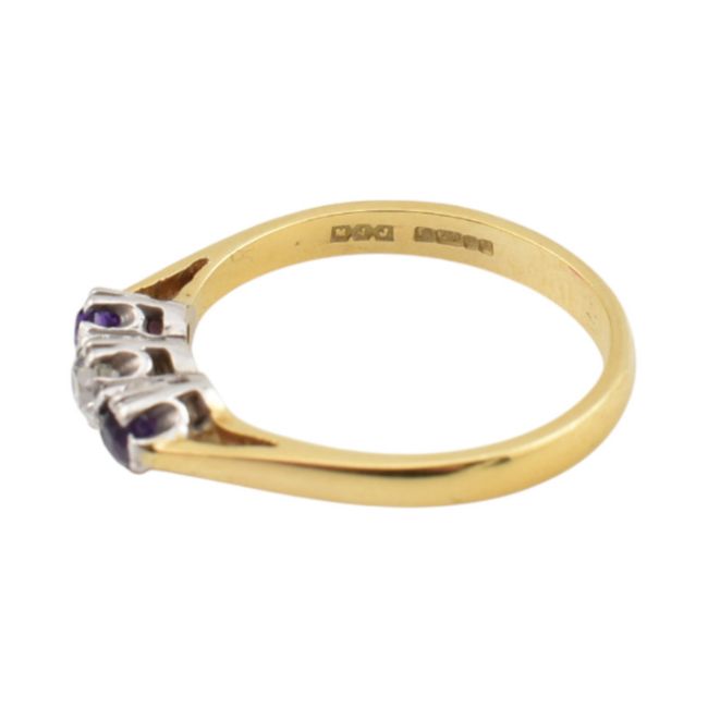 A hallmarked 18ct gold amethyst and diamond three stone ring. Hallmarked Birmingham 1992. Weight 2.7g. Size N.