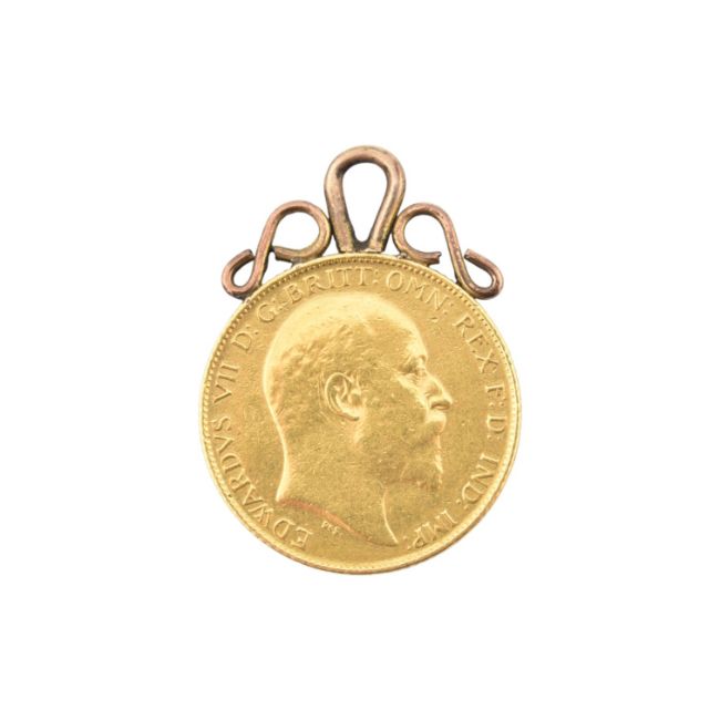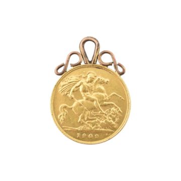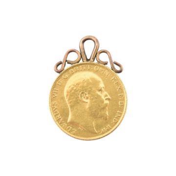 A mounted 1909 half sovereign pendant. The half sovereign with Edward VII and George slaying the dragon to reverse. Total weight 4.3g.
