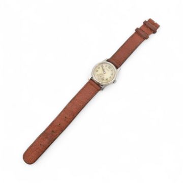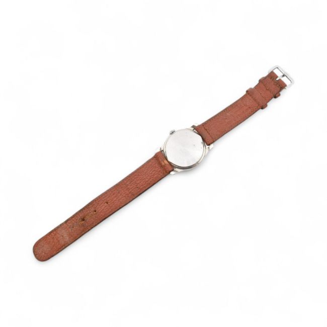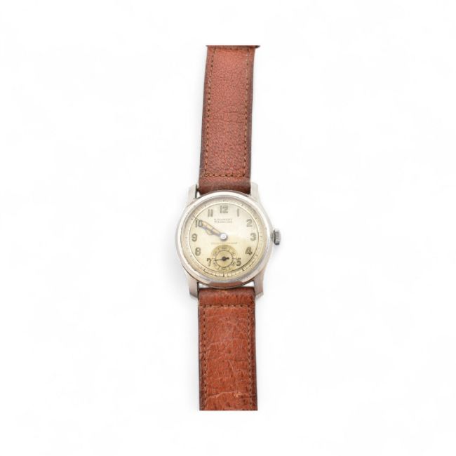 A Vintage early 20th century Orator wristwatch. The stainless steel case with Arabic number dial. Marked for S Diamant Nairobi. Plain case back. The wrist watch with brown leather strap.