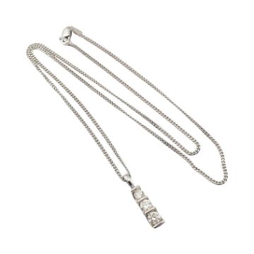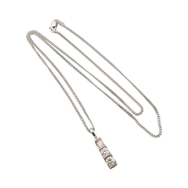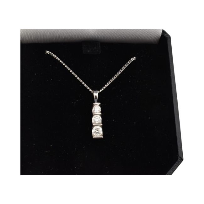 A hallmarked 9ct gold and diamond three stone pendant necklace. The necklace strung with three graduating tension set round brilliant cut diamonds. Estimated total diamond weight 0.50ct. Total weight 4.4g.