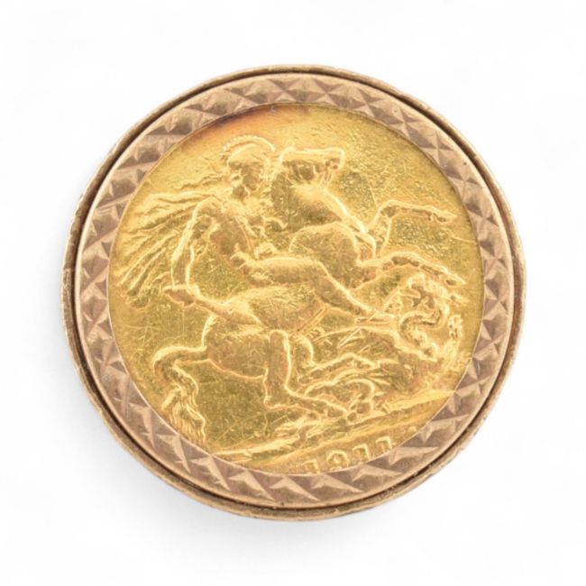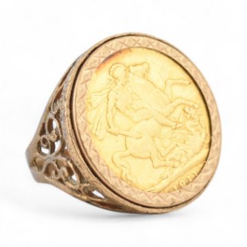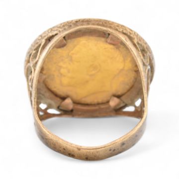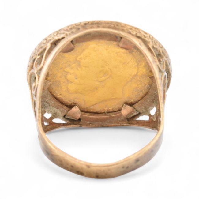 A hallmarked 9ct gold ring set with a full Edward VII 1911 sovereign coin. Weight 13.1g, coin weight 7.98g, size R.