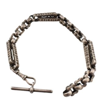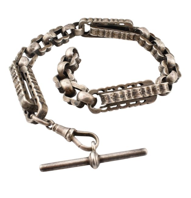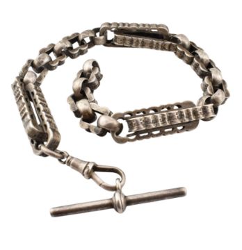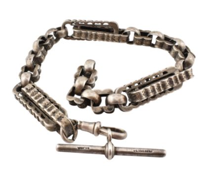 A Victorian 19th century silver book / watch chain with lobster clasp and t-bar. Weight 35.4g. Length 26cm