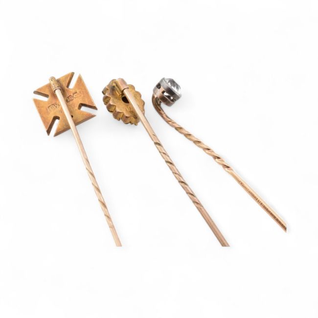 A collection of three late 19th-century lapel stickpins. The pins to include a Maltese cross stamped 15ct. A diamond set pin is unmarked. Together with a gem set pin. Total weight 4.9g.