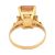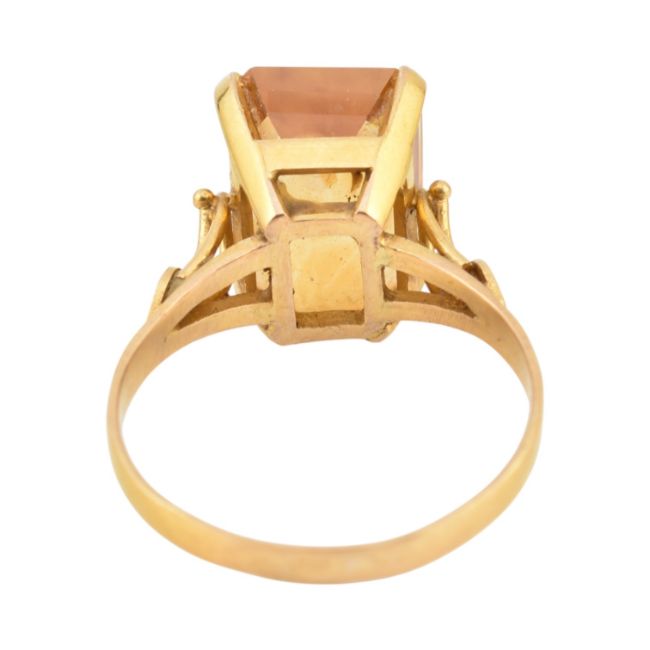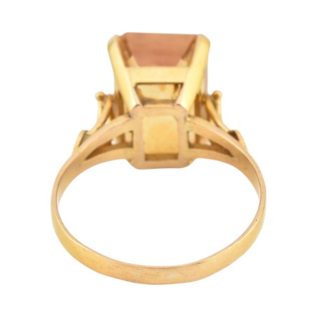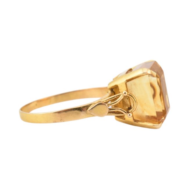 A gold and citrine cocktail ring. The ring set with a step cut citrine Unmarked, tests indicate gold. Weight 5.2g. Size P.
