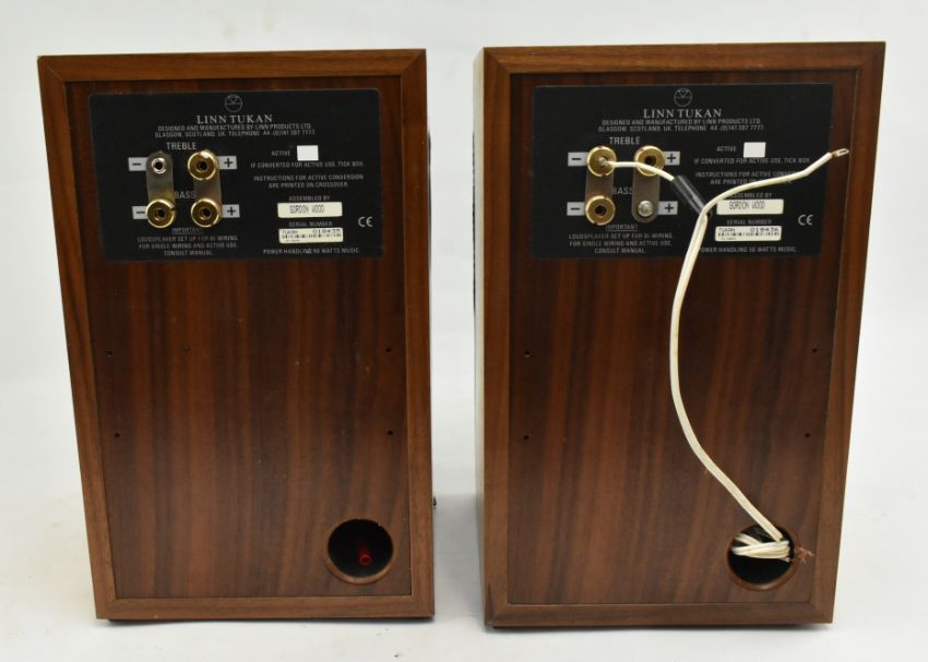 Linn Tukan - a pair of vintage late 20th century circa 1990s teak cased shelf speakers. Each having a mesh covered front. Assembled by Kenny Farrell. Serial number 018435.