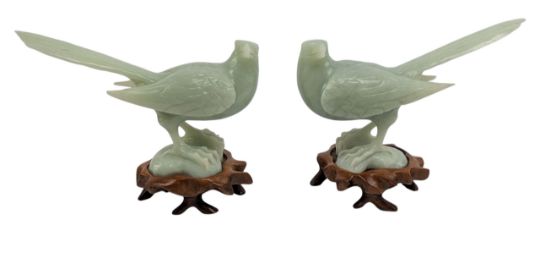A collection of twelve Chinese jade coloured figures. The lot to include a figure depicting a goat family, a figure depicting two horses, a boulder depicting phoenixes amidst flowers and branches, two female deities in traditional Chinese dress, a phoenix on a branch, a pair of birds on stands, a qilin on stand, a dragon, two chickens and a pink quartz lidded vase.