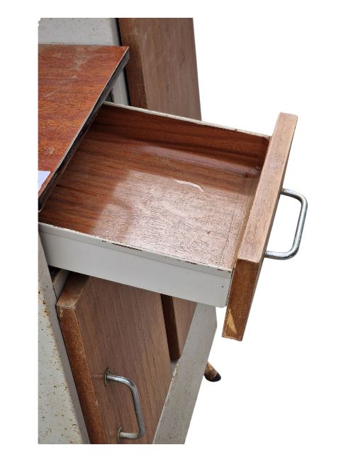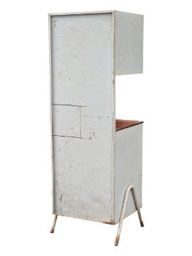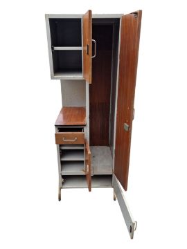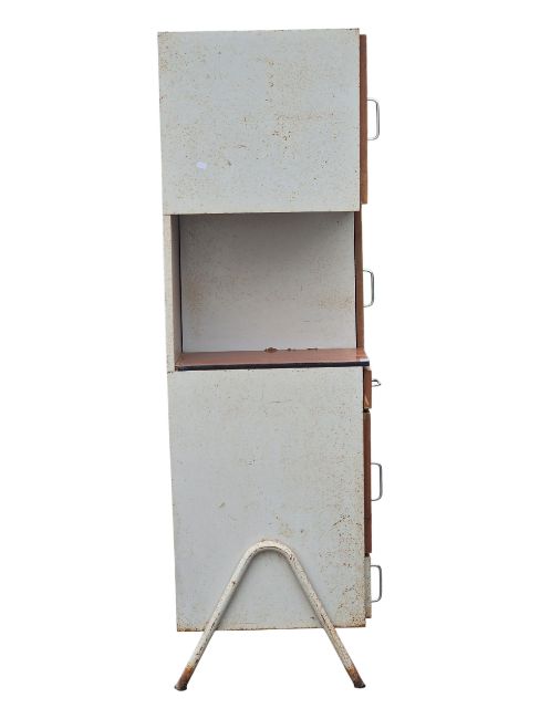 A vintage mid 20th century industrial French military manner bachelors wardrobe. The wardrobe having white painted metal body, with teak veneer doors. Featuring a full length wardrobe to one side, with cupboards and shelf to other. Measures approx: 171x57x53cm