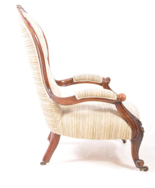 Victorian 19th century spoon back armchair. With mahogany carved show wood, white upholstered striped fabric with padded elbow rests. The button back design has an overstuffed cushioned seat raised on shaped legs terminating in castors. Measures approx: 96x59x77cm