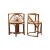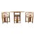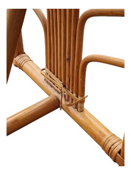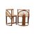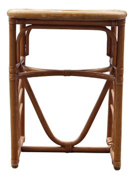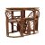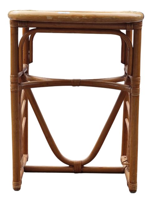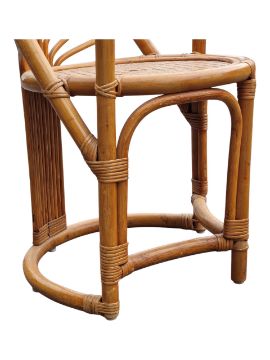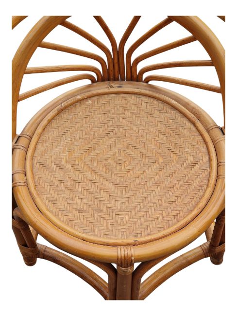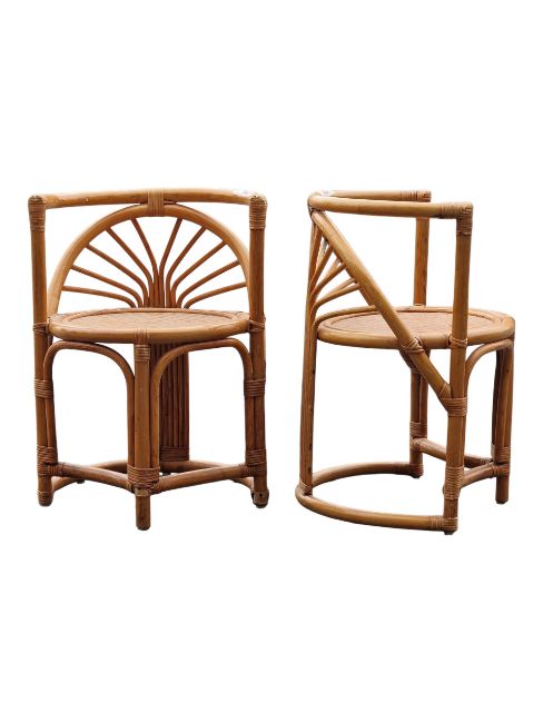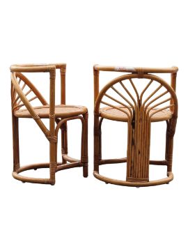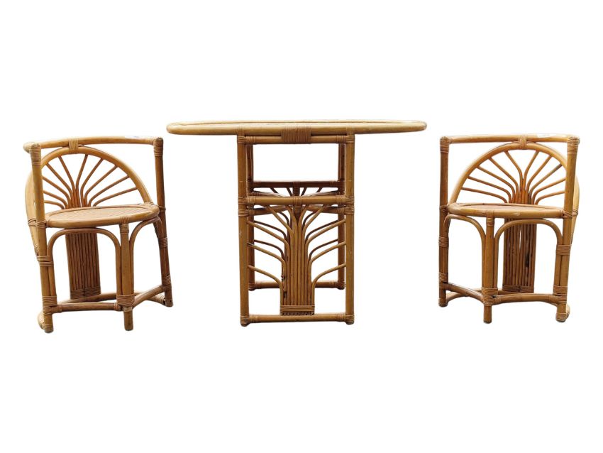 A retro mid 20th Century 1980's bamboo and wicker two person dining / breakfast table having a elongated oval top with rectangular side panel supports with fan decoration united by central curved stretchers. Two chairs of curved circular form that slot in to each end. Wear commensurate with age. Measures approx: 74x100x52cm