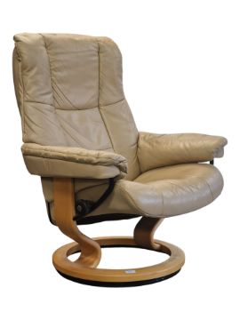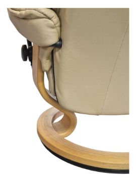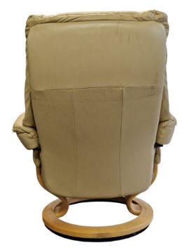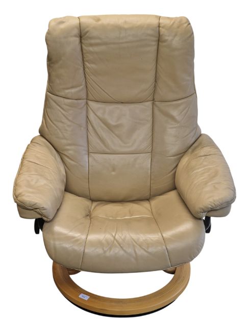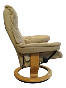 Ekornes - A vintage late 20th century Ekornes Stressless reclining rotating swivel armchair. Cushioned backrest and seat with flat elbow rests, bentwood circular base. Made in Norway. Measures approx: 100x78x70cm
