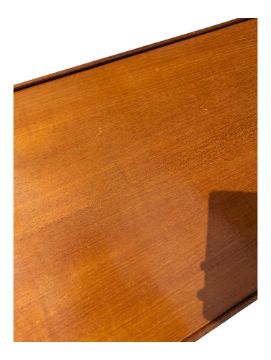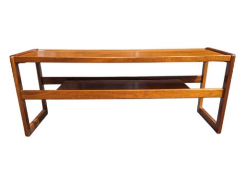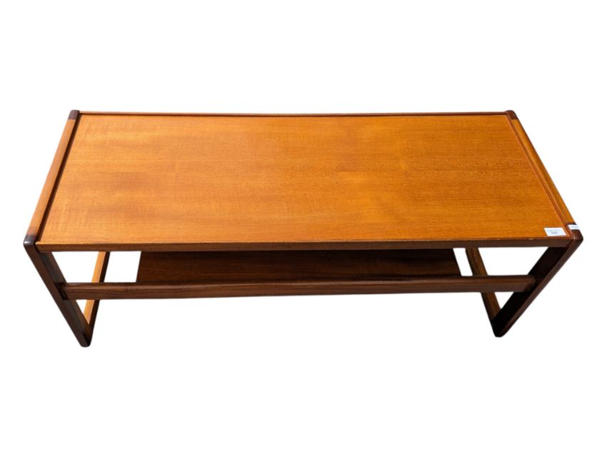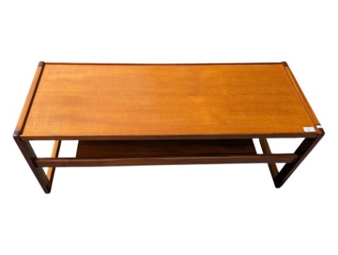 British Modern Design - A vintage mid 20th century teak coffee table. The coffee table raised on G-Plan Quadrille style supports, united by lower tier. Having rectangular top above. Measures approx: 43x111x44cm