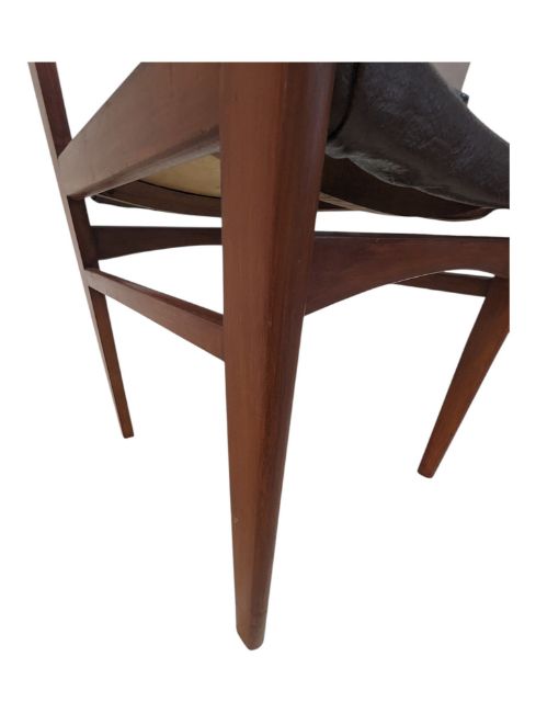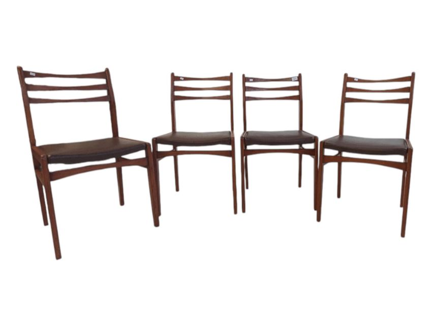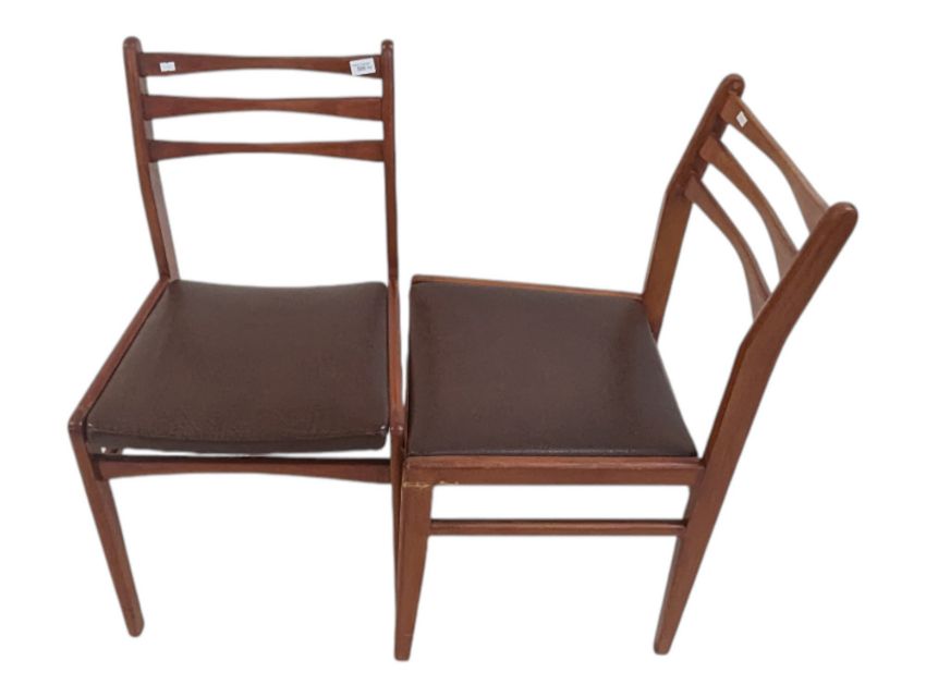 British Modern Design - A set of four vintage mid 20th century dining chairs. The chairs each having a ladderback style backrest, with three shaped horizontal slats. Raised on squared supports united by stretchers. Having black vinyl upholstered seats. Measures approx: 82x46x47cm