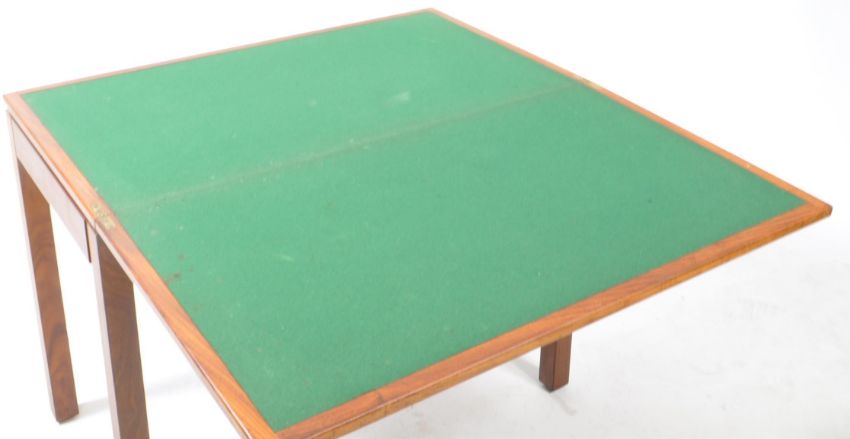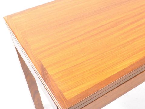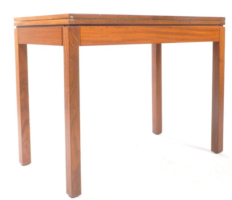 British Modern Design - A vintage 20th century folding teak games card table. Rectangular form fold over extending games surface table with upright square supports to the corners.