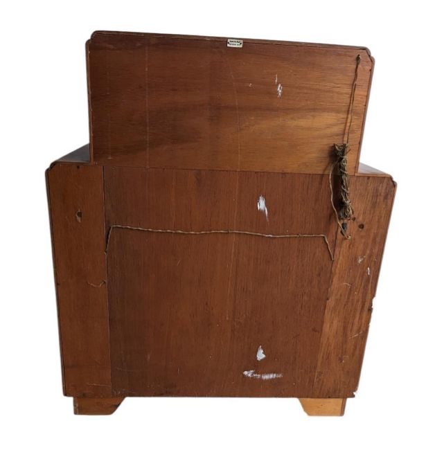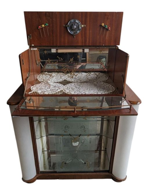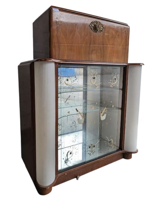 A retro 20th century circa 1930s Art Deco metamorphic cocktail cabinet with appointed interior and transfer printed glass shelves within. Measures approx: 111x92x38cm