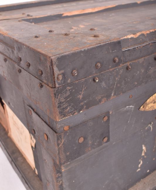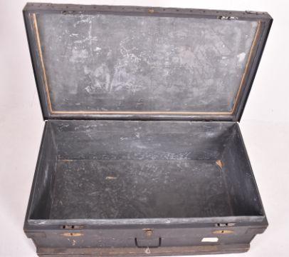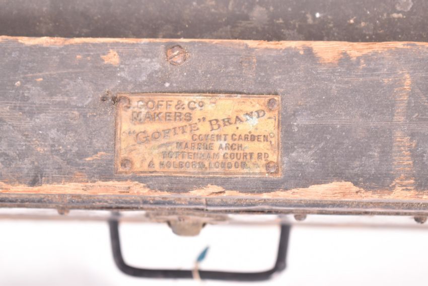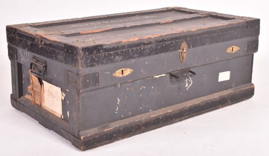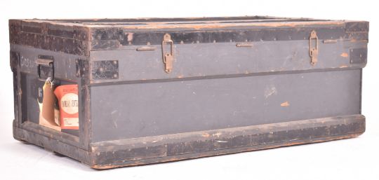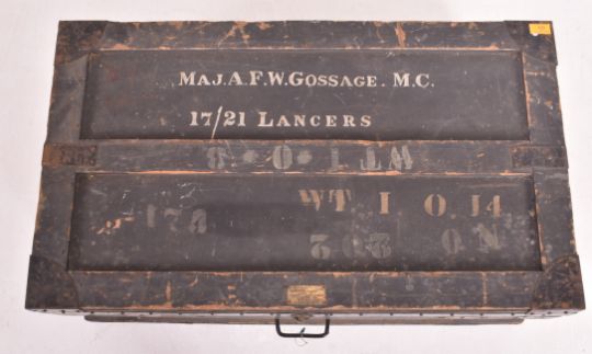 S. Goff & Co Makers - Gofite Brand - Covent Garden, London - a military early 20th century wooden & metal bound 17th/21st Lancers trunk chest. The trunk reading to top Maj. A. F. Gossage M.C. 17th/21st Lancers. Makers plaque to top. Twin handles to side.