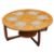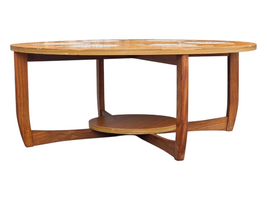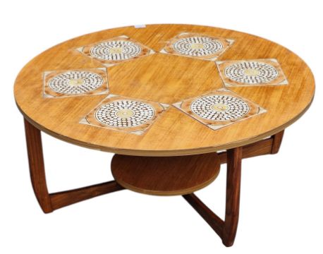 British Modern Design - A vintage mid 20th century circa 1970s teak coffee table. The table of circular form, with six inset tiles to top. Raised on squared supports united by round lower tier. Measures approx: 38x94cm