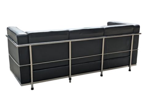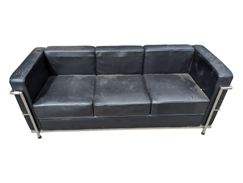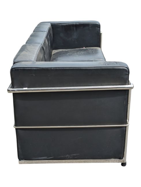 After Le Corbusier - LC3 - A vintage LC3 type three seat club sofa settee. The seat having an exterior tubed chrome finished frame being upholstered in a black leather upholstery complete with squab cushions. Measures approx: 63x185x69cm