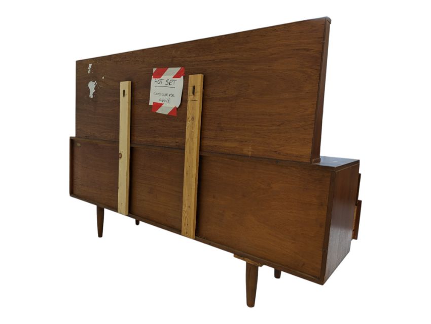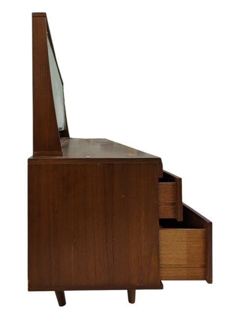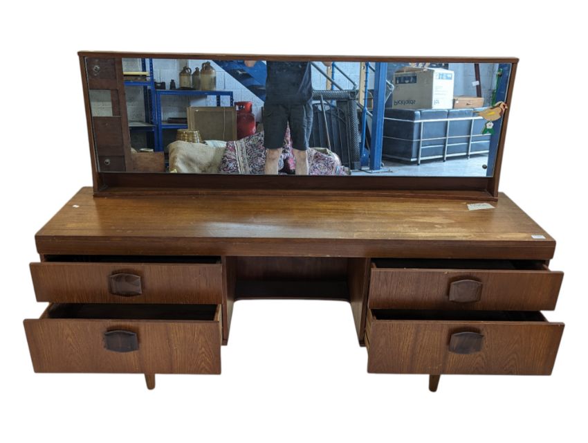Stonehill Furniture - Mid century teak wood dressing table. Raised on turned legs having a low and wide body with pull handles. Above, a large wide mirror. Measures approx: 117x166x44cm