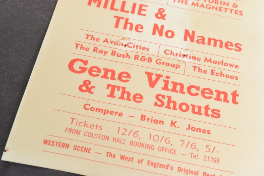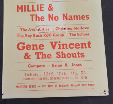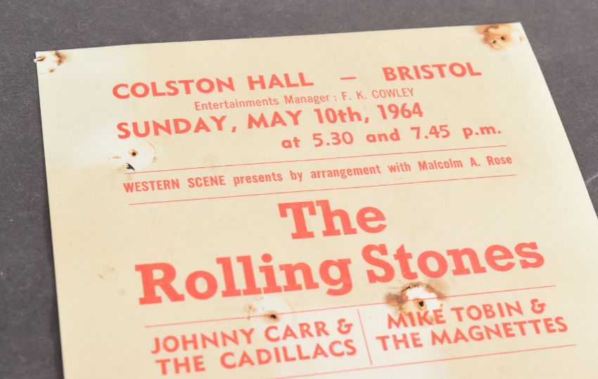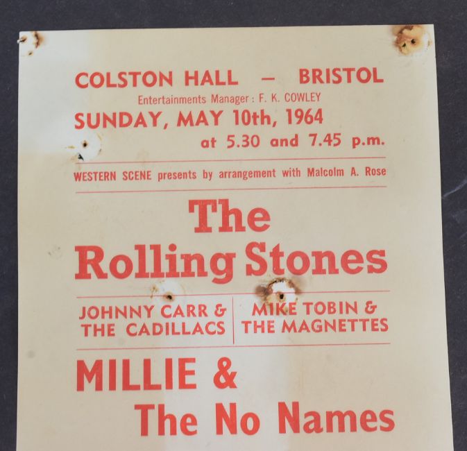 The Rolling Stones (English Rock Band Formed 1962) - Bristol Colston Hall - original handbill / flyer for a concert on Sunday May 10th 1964 featuring The Rolling Stones, Mille & The No Names, Gene Vincent and others. Some discolouration, pin holes to corner and centrally. Not folded. Obtained by the vendor at the concert. 21cm x 12.5cm.