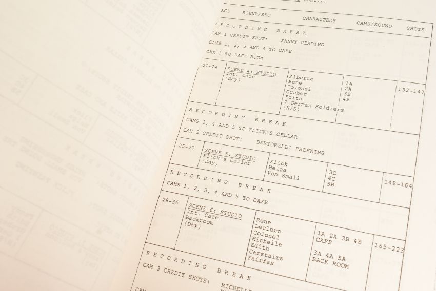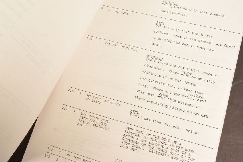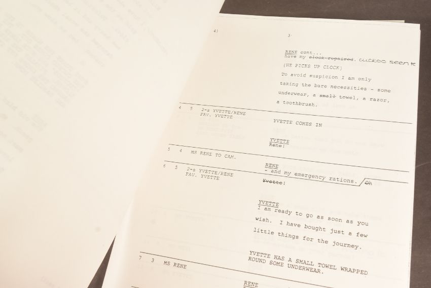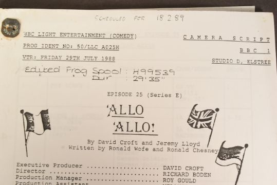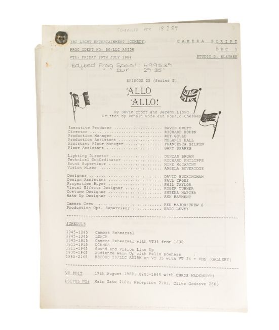 'Allo 'Allo! (BBC Sitcom 1982-1992) - Series 5 Episode 25 - original production used 'TX' script for the fifth series. Dated 29th July 1988. 57pp, plus Running Order pages, Cast List, and cover on white paper stock. Features the 'Allo 'Allo titles and illustrated flags to the cover. Original production used script.