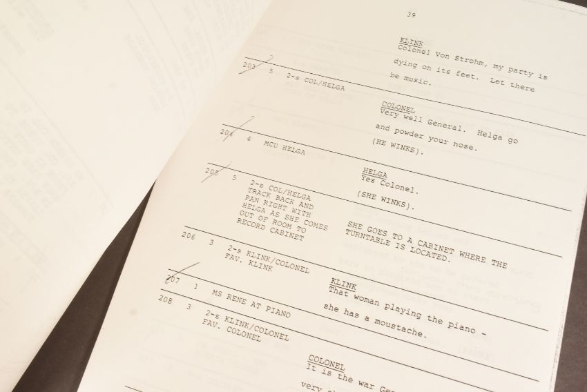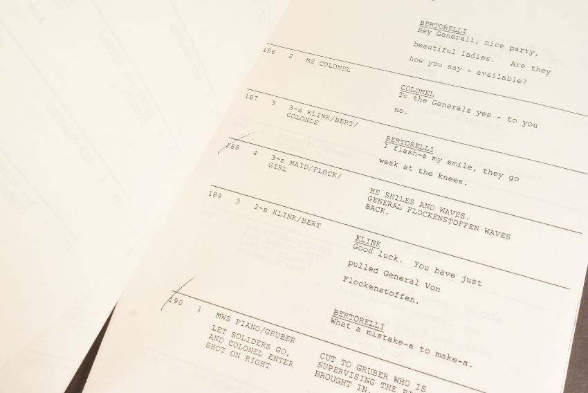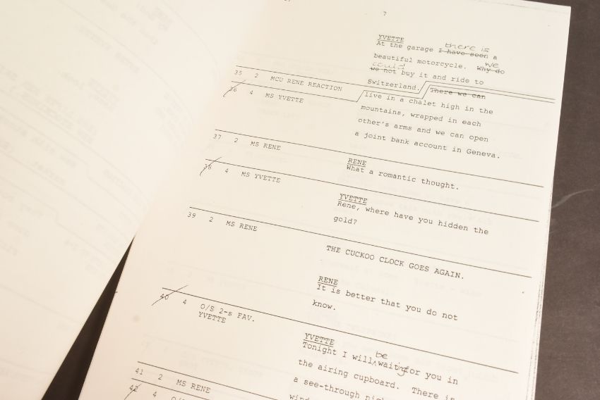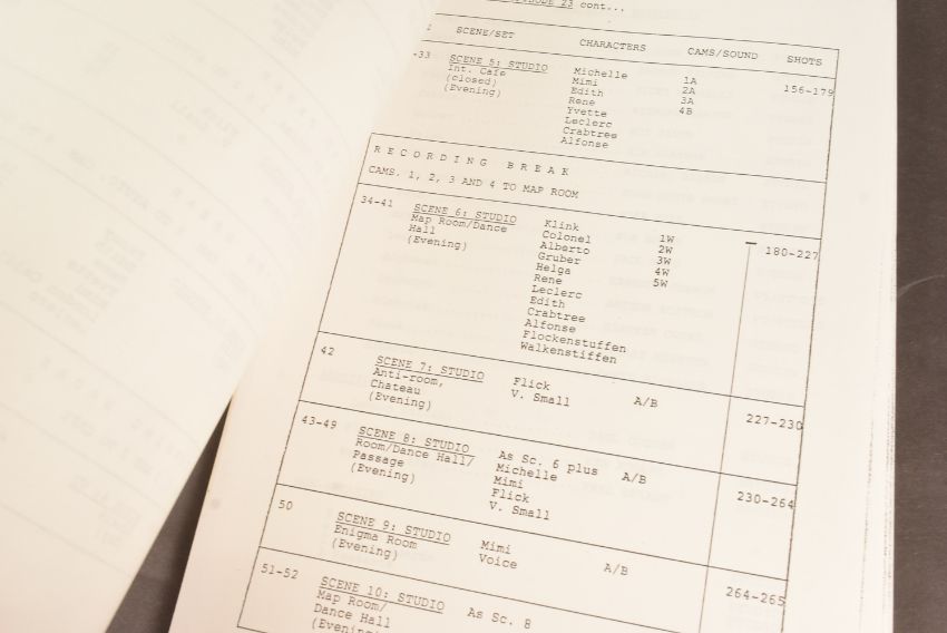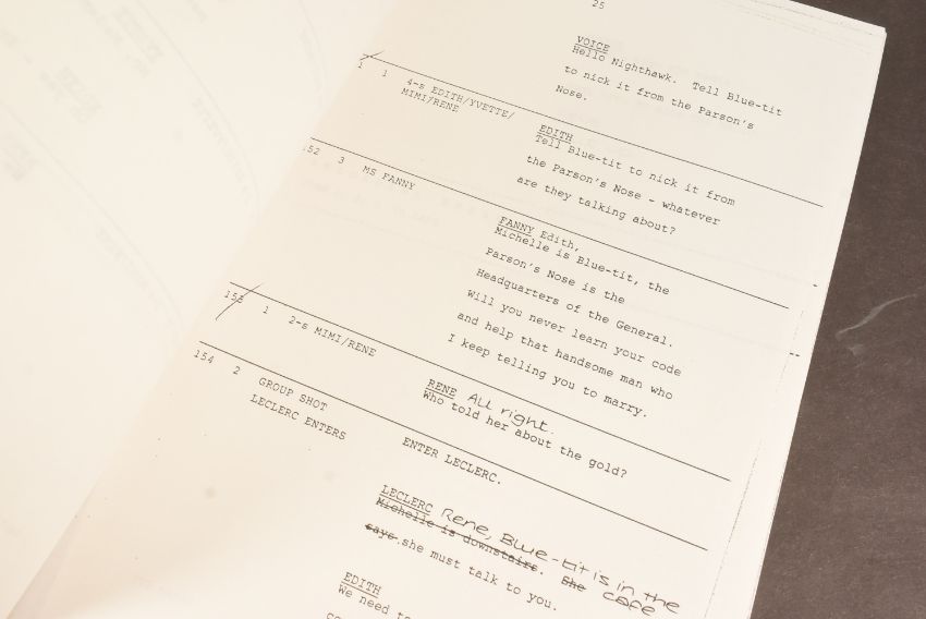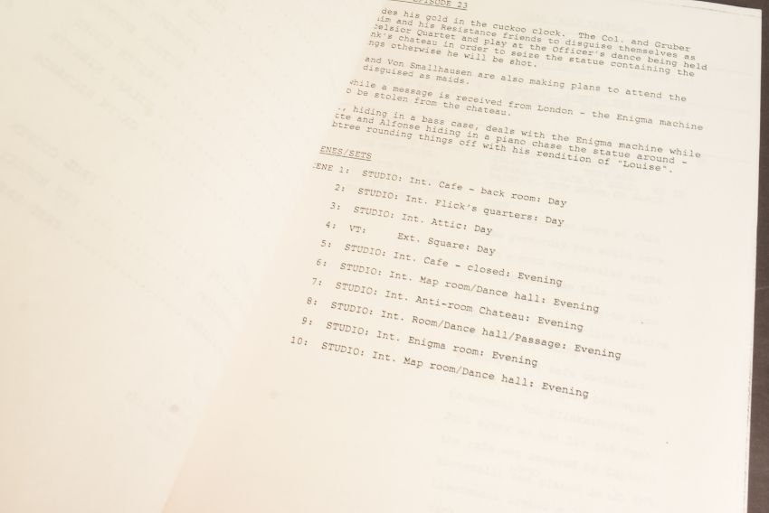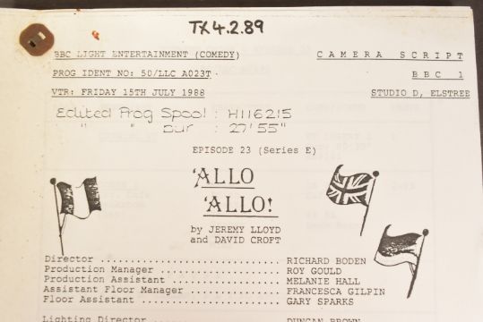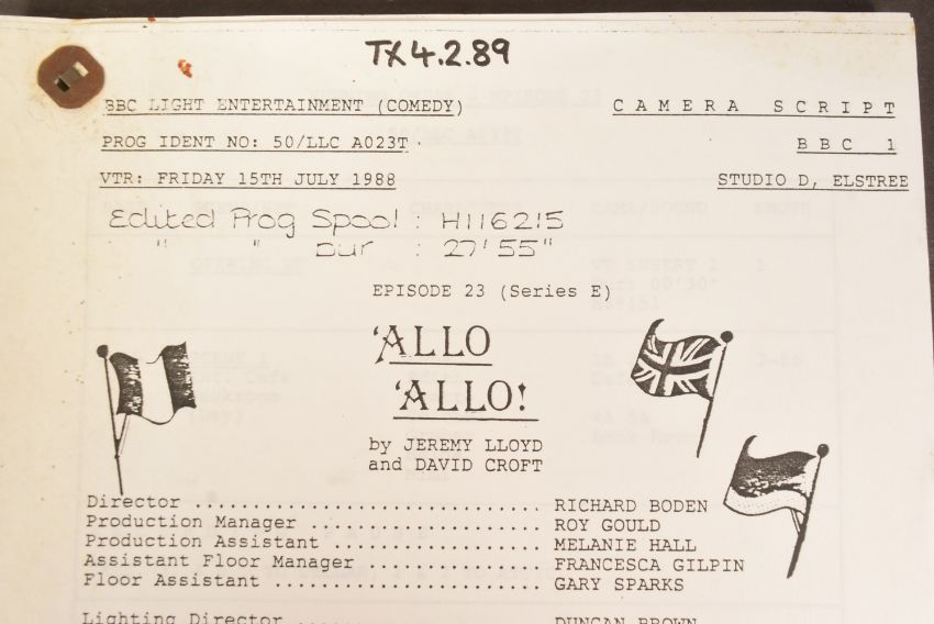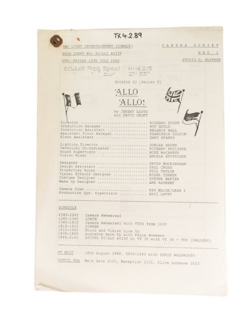'Allo 'Allo! (BBC Sitcom 1982-1992) - Series 5 Episode 23 - original production used 'TX' script for the fifth series. Dated 15th July 1986. 52pp, plus Running Order pages, Cast List, and cover on white paper stock. Features the 'Allo 'Allo titles and illustrated flags to the cover. Original production used script.