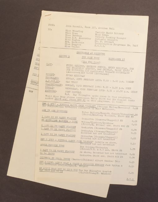 The Goon Show (BBC Radio Comedy Programme 1951-1960 starring Spike Milligan, Harry Secombe and Peter Sellers) – an original recording script owned and used by producer John Browell for Series 9, Programme 17 ‘The £50 Cure’. The script is well annotated throughout in Browell’s hand, with stage directions, altered lines, and general notes taken during recording. His name ‘John’ is noted to the cover page. 28pp, plus cover. With original RX / transmission details sheet. (2)