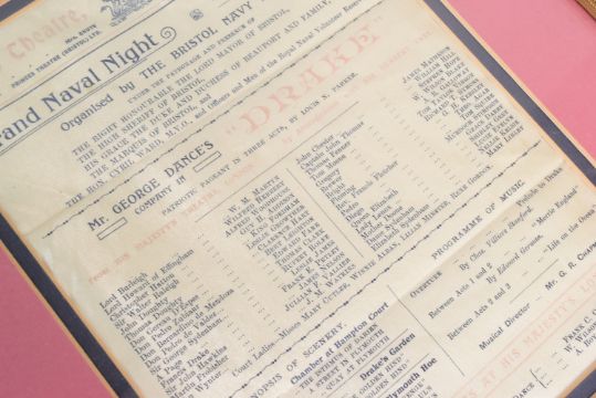Theatre Interest - 1913 silk programme from the Princes Theatre, Park Row, Bristol for a 'Grand Naval Night' Monday October 13th 1913 organised by the Bristol Navy League. Attended by the great and good of the city, with a performance of 'Drake' 'As At His Majesty's London'. Framed and glazed. Total size: 40cm x 32cm.