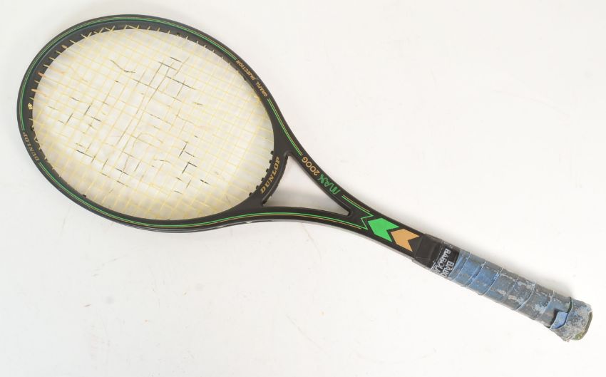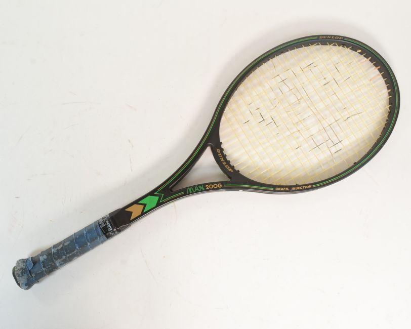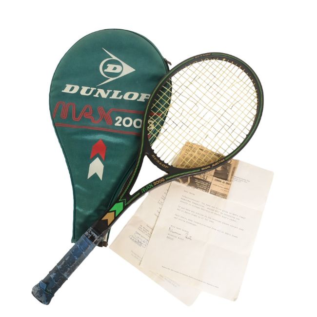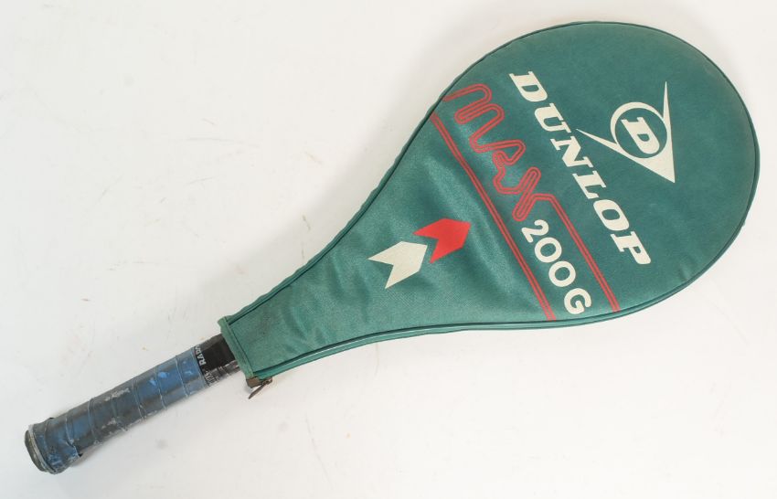 Tennis - Steffi Graf's match used Dunlop 200G racket from her famous Wimbledon win against Martina Navratilova in 1988. The green and black Dunlop racket bears her (now faint) signature to one side, and retains the original cover. Measures approx: 70cm long. Unique and special piece of Wimbledon history.
